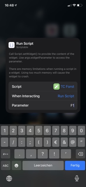 Um den Benutzernamen und das Passwort zu speichern tippt in „Scriptable“ auf das automatisch gespeicherte Script „TC Forst Anmeldedaten setzen“ und es wird gestartet.